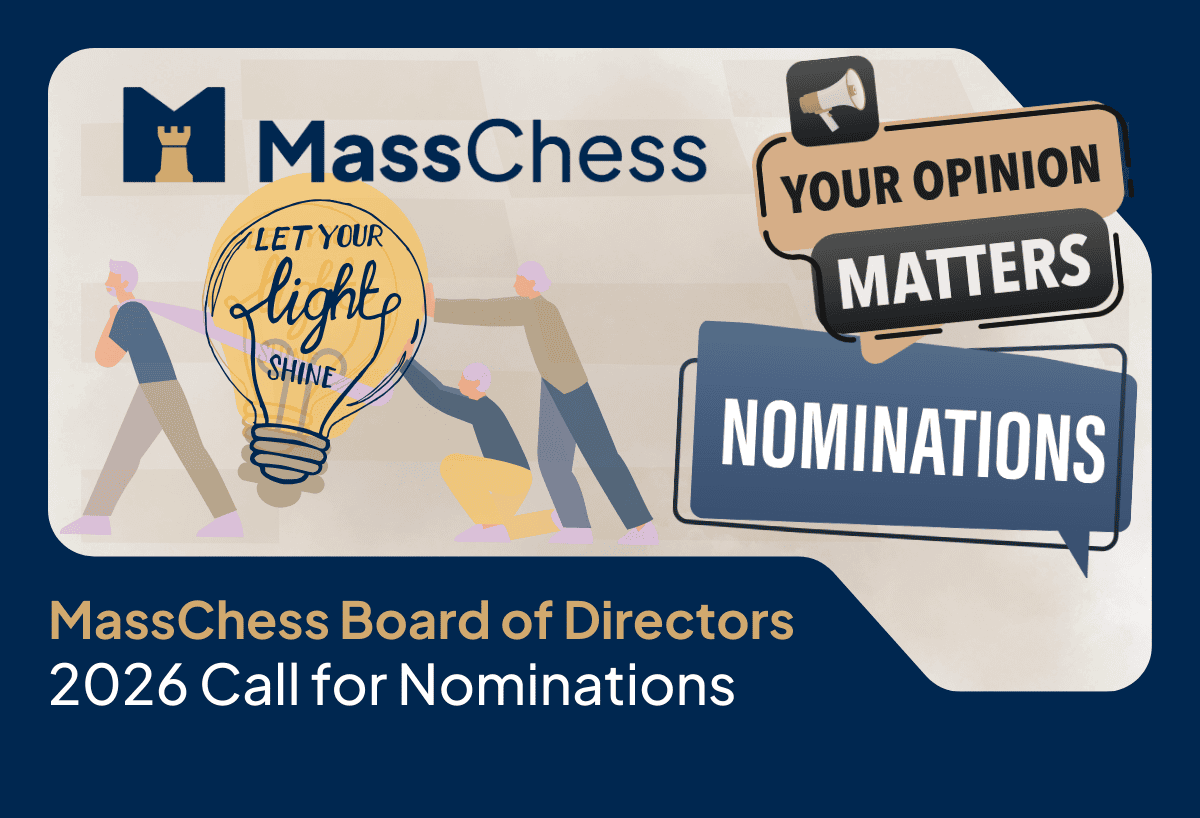 | | | Whether you're a player, parent, coach, and/or organizer—your unique skills, ideas, and energy are all very much needed! Please run for a position on the Mass Chess board, and let’s work together to build a future for chess in Massachusetts that is brighter than ever!