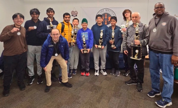 NM Lawyer Times (right), owner, Future Masters Chess Academy, stands next to 2025 New England Blitz Champion GM Alexander Ivanov and the rest of the winners circle. (Photo: Frank Delbonis)