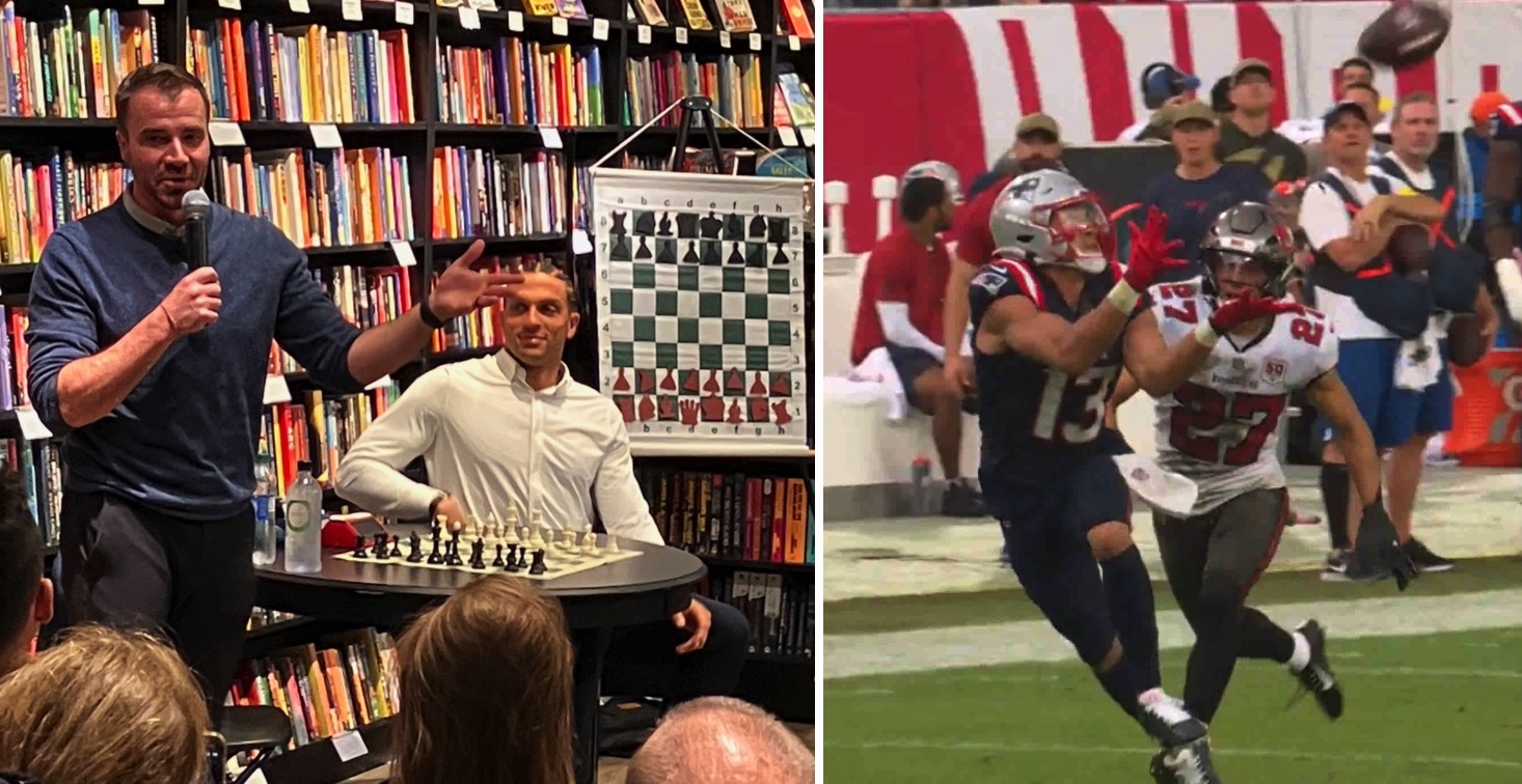 Hummingbird Books in Chestnut Hill welcomed Chess.com co-founder Danny Rensch to celebrate his new memoir, Dark Squares, followed by a blindfold chess game vs New England Patriots wide receiver Mack Hollins. Details...